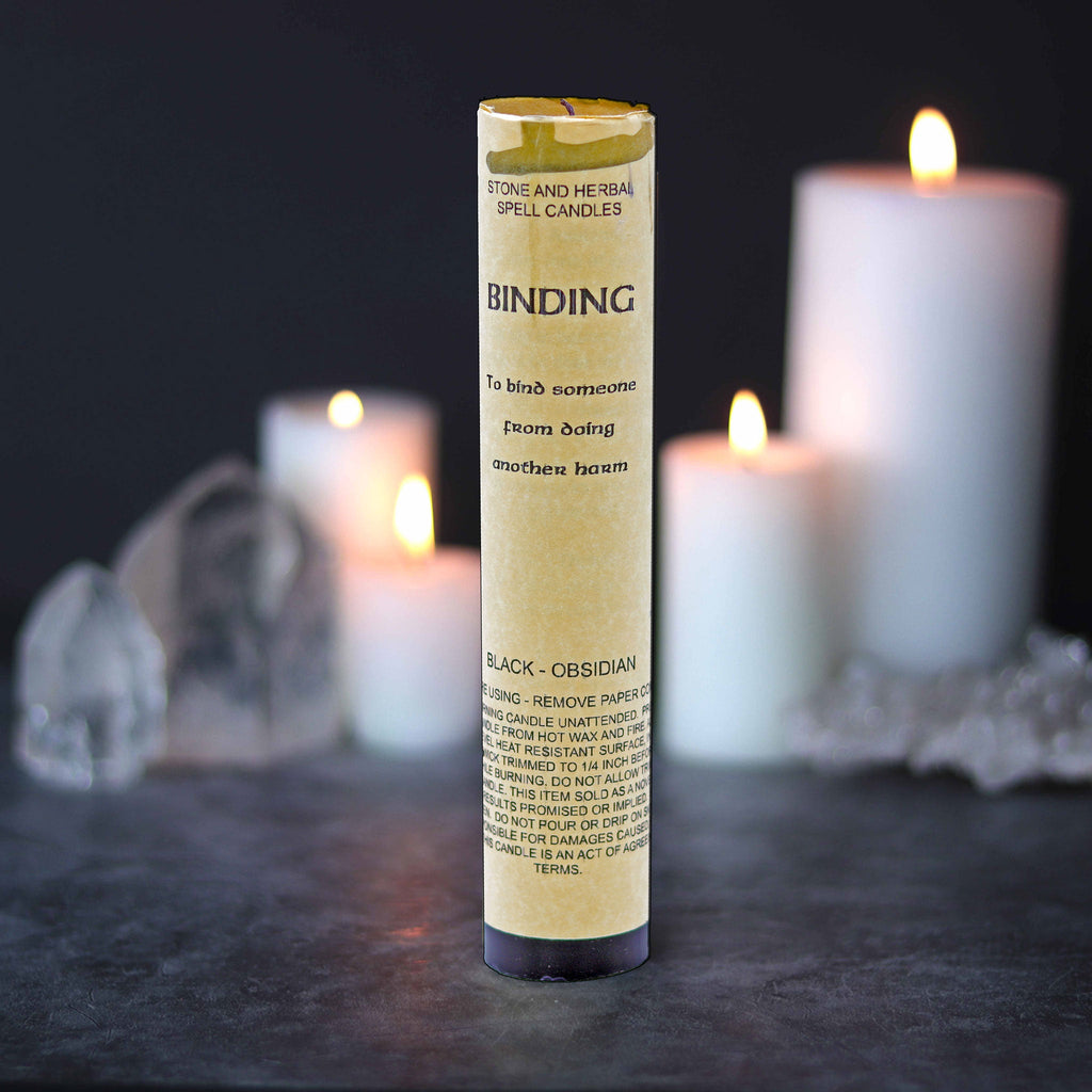 Each handcrafted spell candle is made in a ritual setting and charged with herbs and includes a Black Obsidian stone. This candle is for binding someone from doing harm to another.