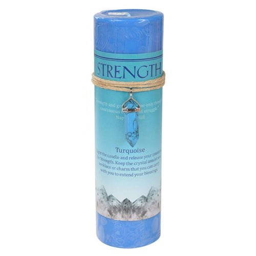 Light the candle and release your intentions for Strength. Keep the Turquoise amulet as a necklace or charm that you can carry with you to extend your blessings.