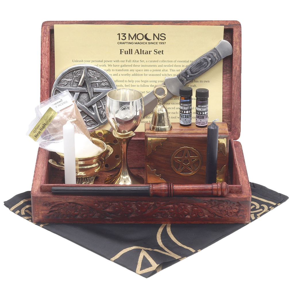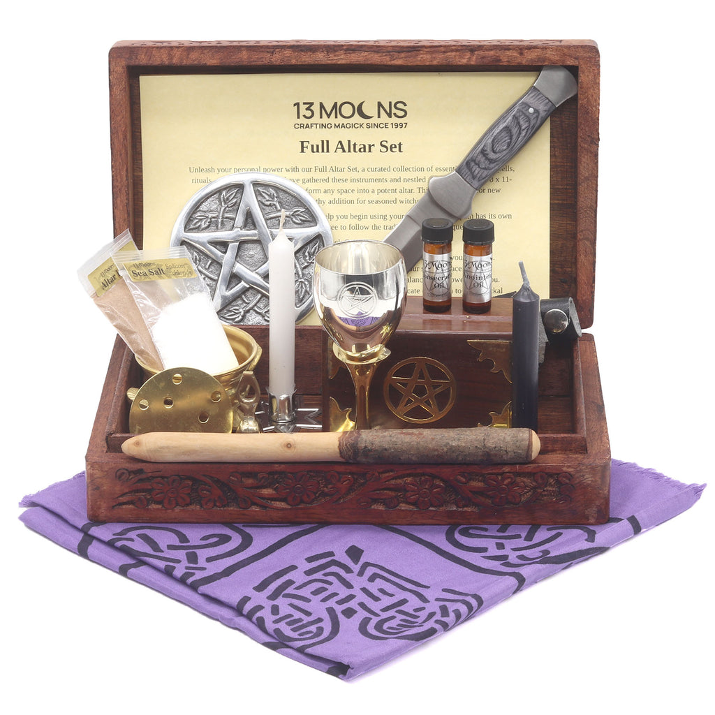 Your Full Altar Set includes a wonderful collection of altar tools to help you create a magickal array of spells, charms and more. We have assembled your set to fit comfortably into a 8 x 11 inch wooden altar box. This is an excellent set for any level of witch or wizard. Included are some of the most essential altar tools for rituals and spell-crafting.
