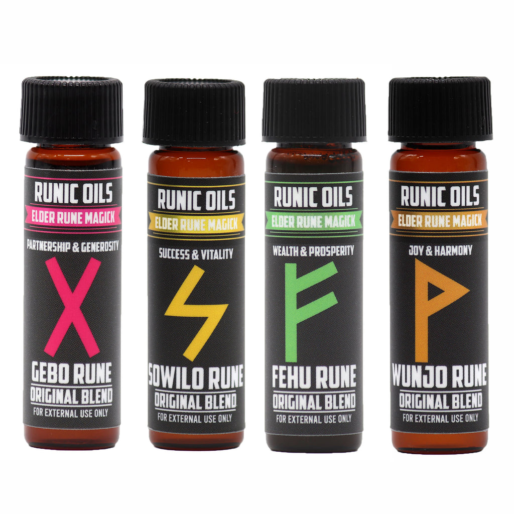- Includes: Four (4) separate vials: Fehu, Gebo, Sowilo, Wunjo.