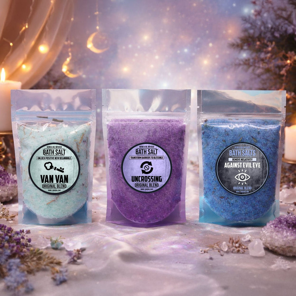 Begin with Uncrossing Bath Salts to clear crossed conditions, lingering negativity, or heavy energy blocking your path. This step focuses on removal and reset, creating a clean energetic foundation.