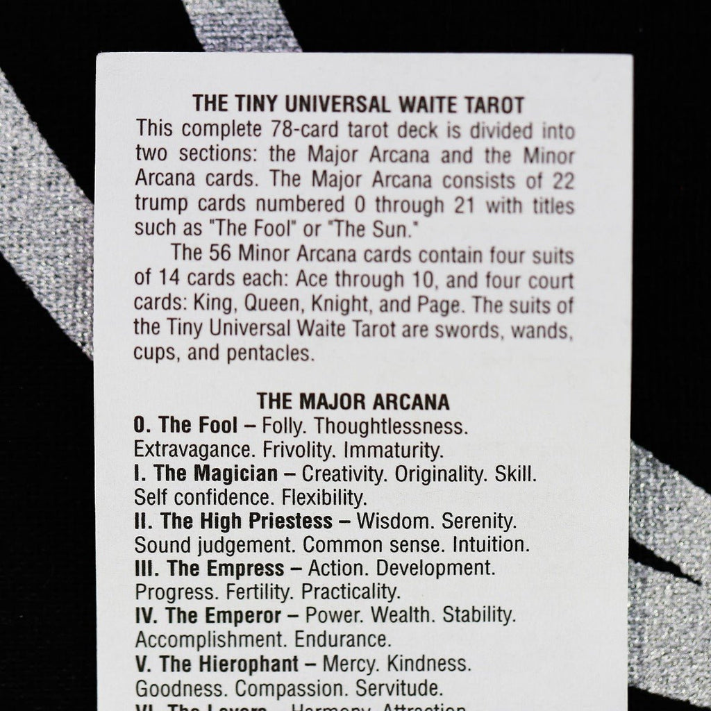 - A complete 78-card Tiny Universal Waite Tarot deck.